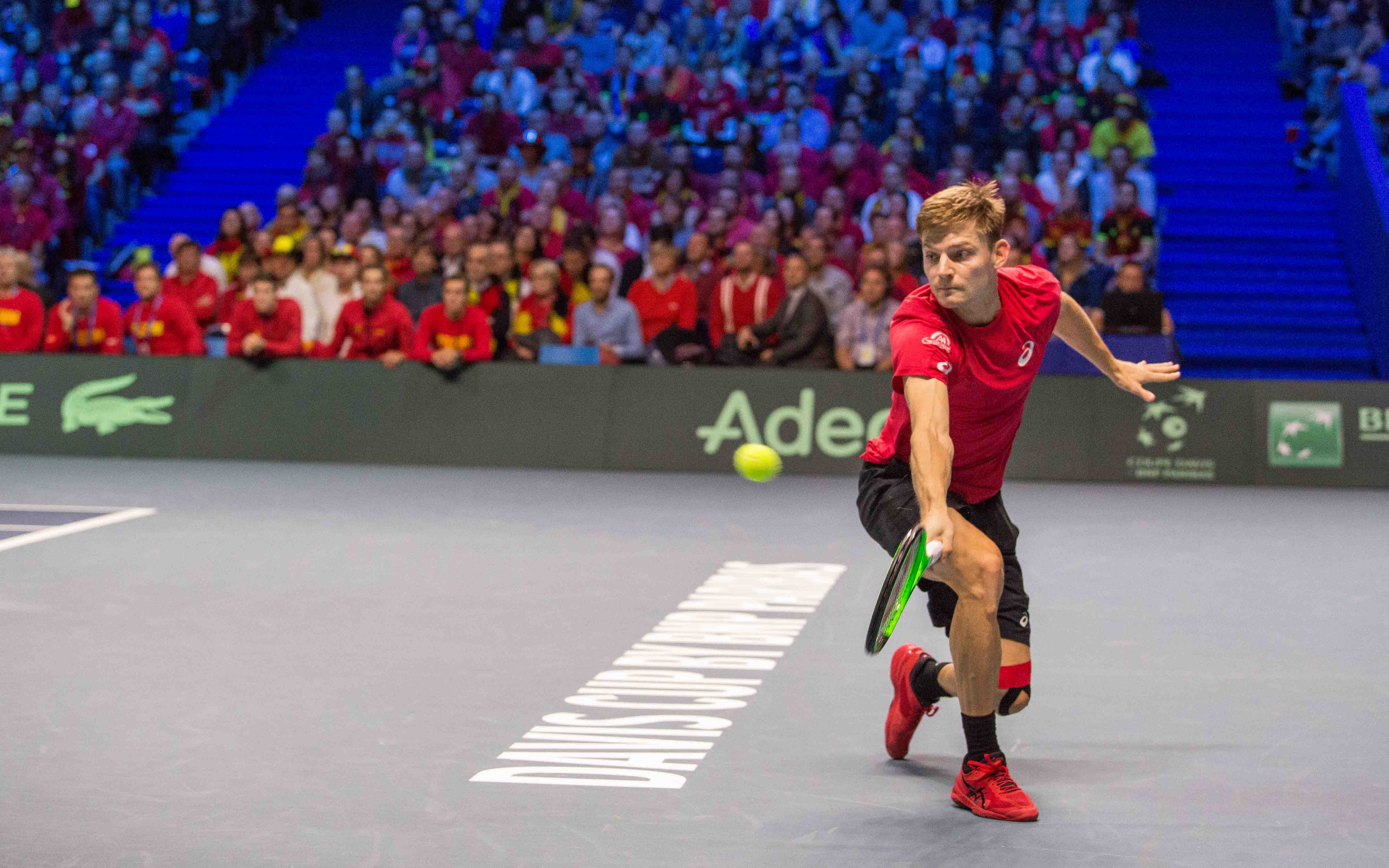 Pour ce premier jour de compétition, Lucas Pouille ouvrait le bal en étant opposé au numéro 1 belge, David Goffin. Porté par sa vague de victoires des semaines précédentes, Goffin s'est facilement imposé en 1h57, 7-5, 6-3, 6-1, offrant ainsi le 1er point de cette finale à la Belgique.
